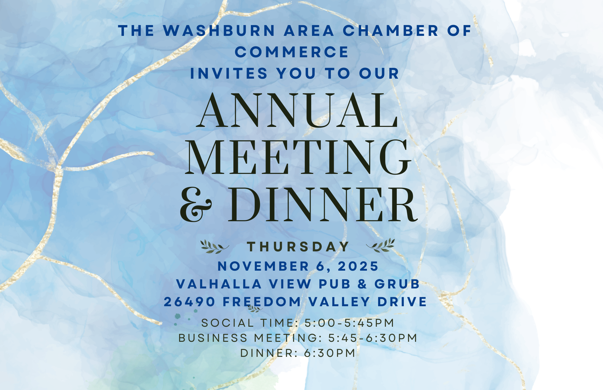 Current chamber members are invited to join the Washburn Area Chamber of Commerce for its annual dinner on November 6th, 2025 at the Vallhalla View Pub & Grub. The evening starts at 5PM with social time, followed by a brief business meeting from and then a delicious dinner at 6:30 PM. Tickets are just $40 ...
