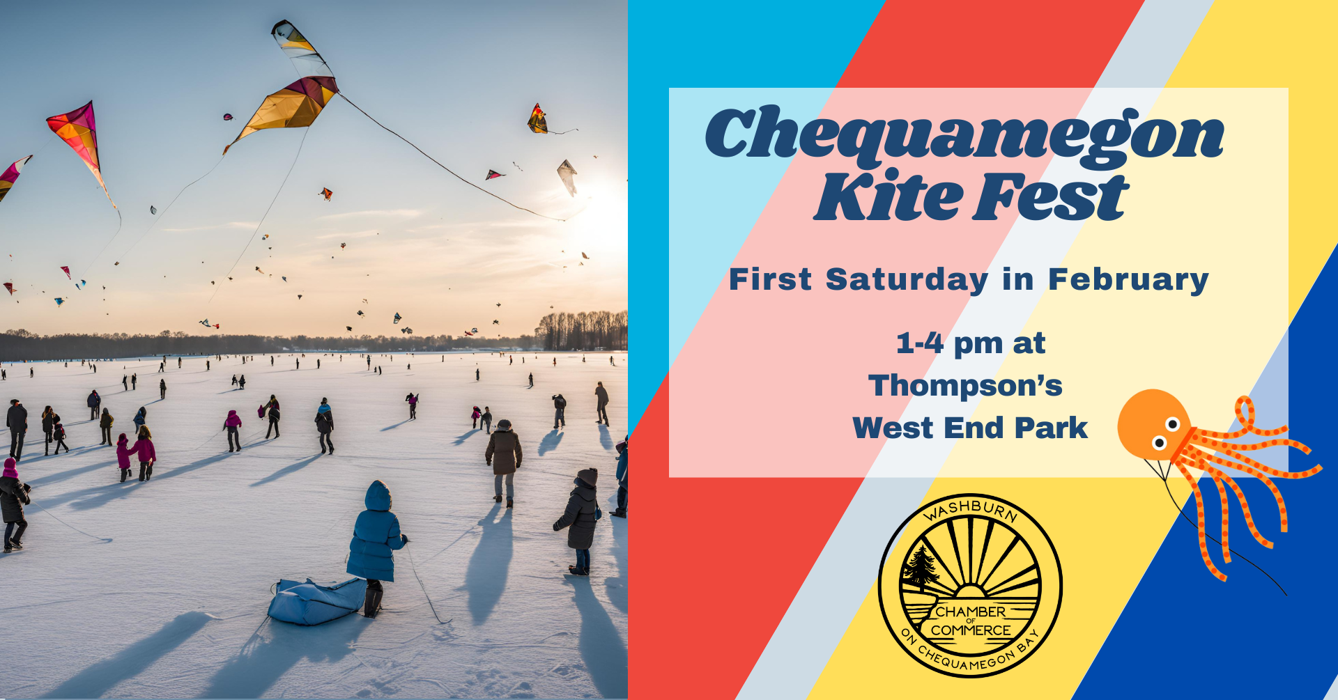 Thompson's West End Park 401 8th Ave W, Washburn, WIChequamegon Kite Fest is back on Saturday, Feb. 7th from 1-4pm. Join us for a beautiful afternoon of fun, friends, flying and more on frozen Lake Superior. Bring your own kite or borrow one from Chequamegon Kiting. There will be a fire going in the fire pit by the pavilion to keep warm (weather permitting) ...